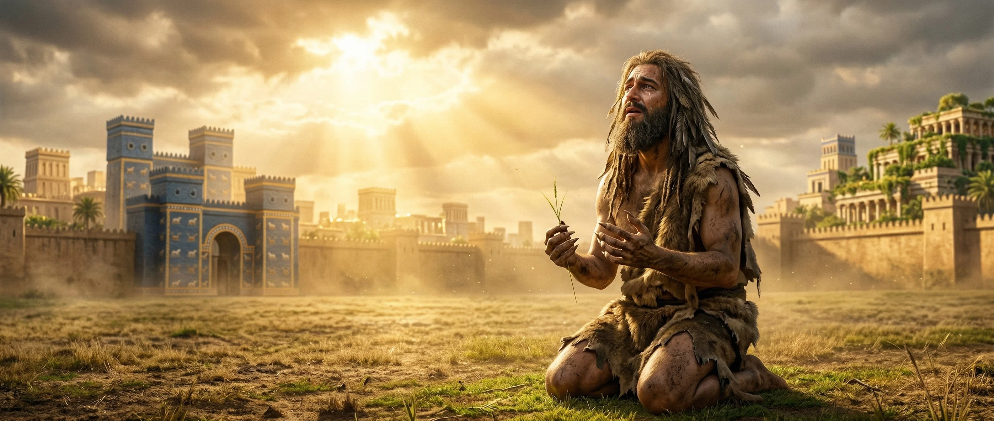A humbled king gazes toward heaven as golden light signifies his miraculous restoration and profound realization of God's grace. This powerful moment captures the transition from earthly pride to a joyful surrender before the Most High.