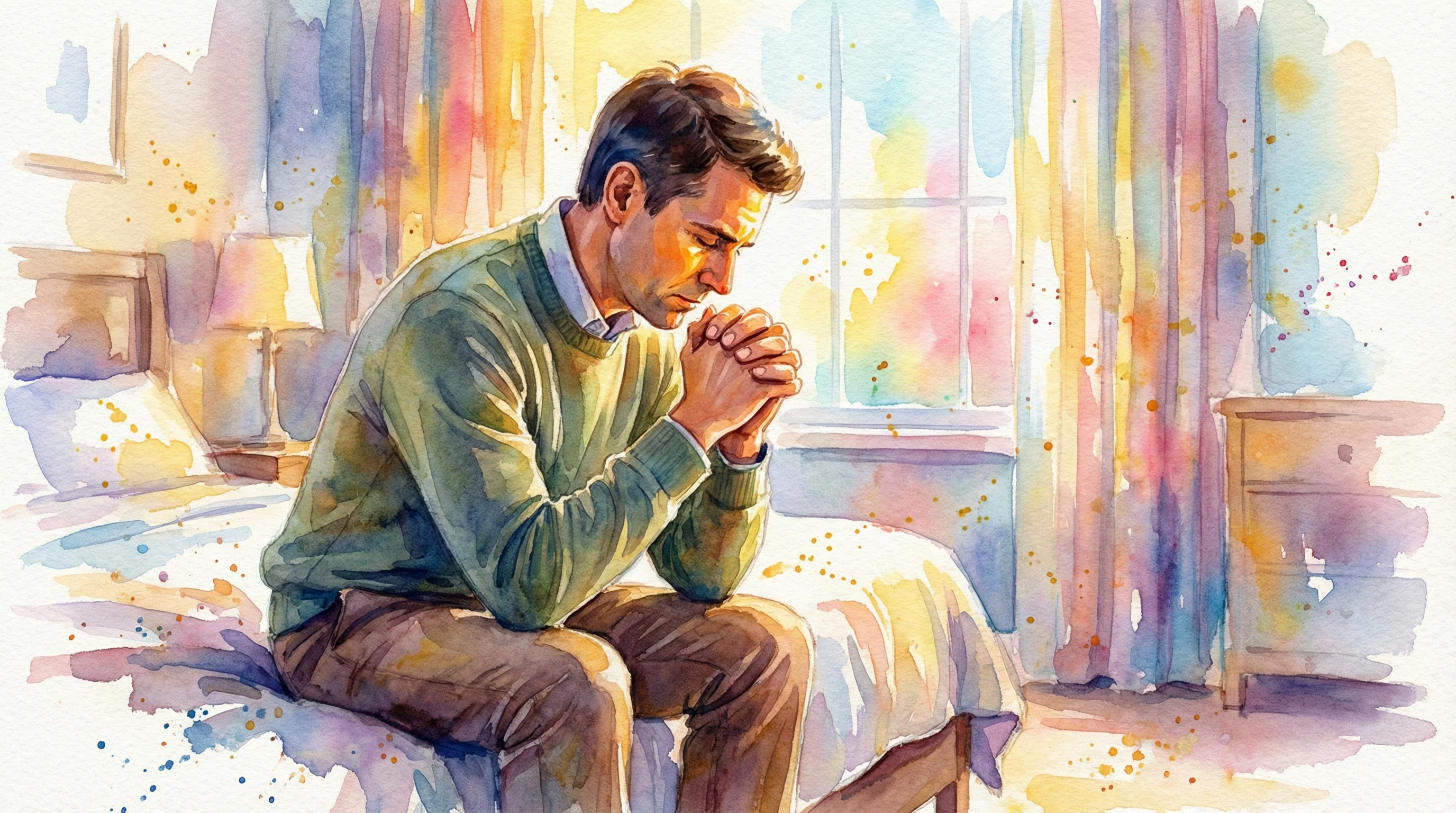 [SETTING: .] Inside a cozy, modern bedroom with a large window showing a vibrant, colorful sunrise. 1 adult man kneels beside his bed in deep, fervent prayer, his hands tightly clasped together, acknowledging his human weakness and need for God's strength. He wears neat casual slacks and a warm sweater. The room is filled with bright, colorful morning light piercing through the curtains, casting a hopeful, golden glow on his face and shoulders. The emotional atmosphere is one of humble surrender and profound spiritual connection. Colourful, and bright. No text.