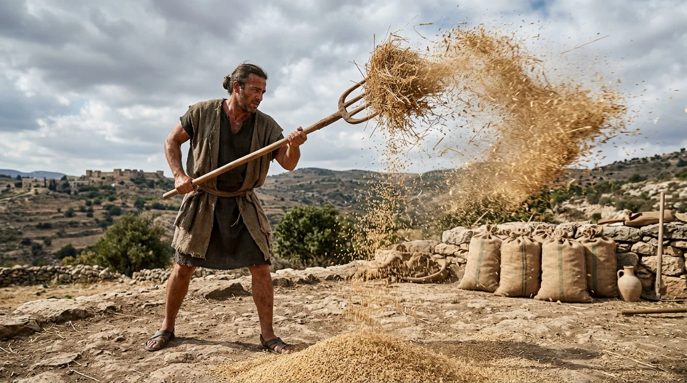 A laborer winnows wheat at the threshing floor as the evening breeze separates the golden grain from the chaff. This ancient scene captures the essence of hard work and divine provision under a vast, dusty sky.