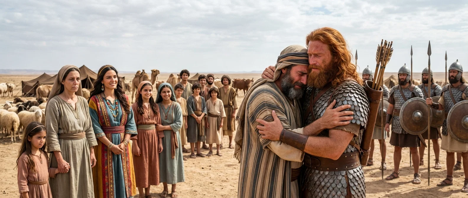 Under a vast sunlit sky, Jacob and Esau embrace in a powerful moment of forgiveness and peace. Their sprawling families gather in the golden light, marking a long-awaited reunion of hearts.