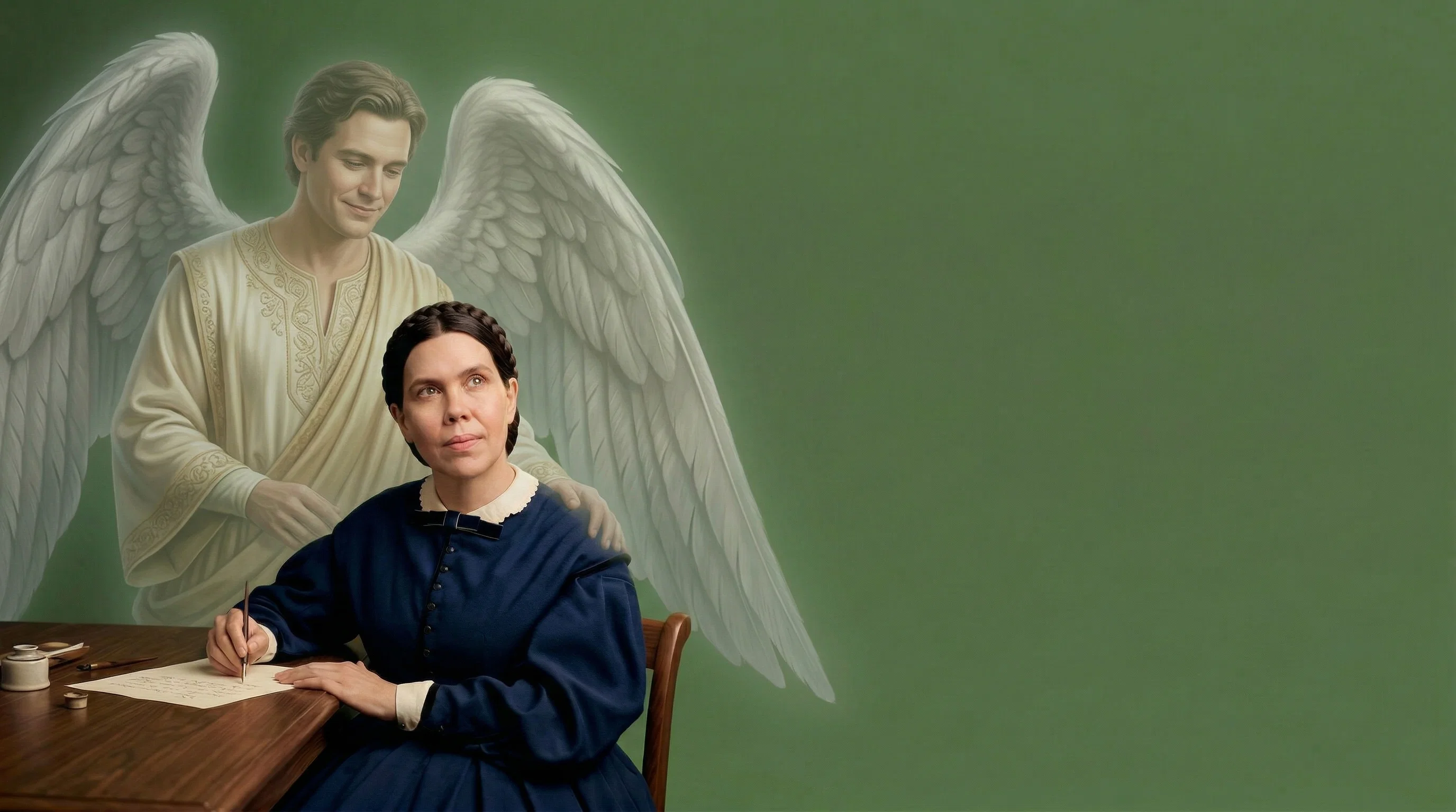 A translucent angel stands gently behind Ellen White, offering divine protection and guidance. The soft light leaves ample space for sacred text to illuminate the composition.