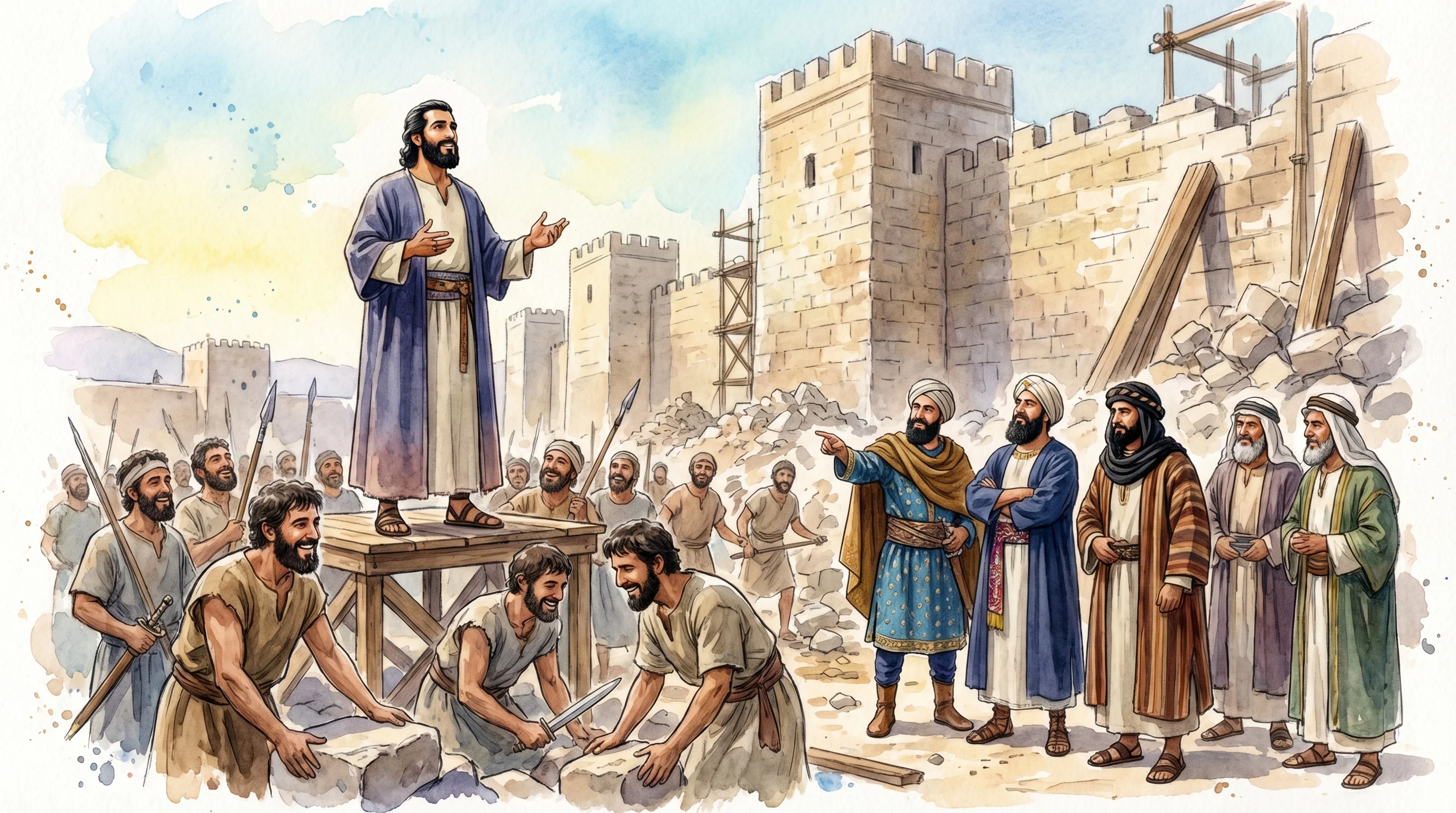 Joyful builders work in unison to restore the holy city while watchful adversaries loom in the shadows plotting against the progress.
