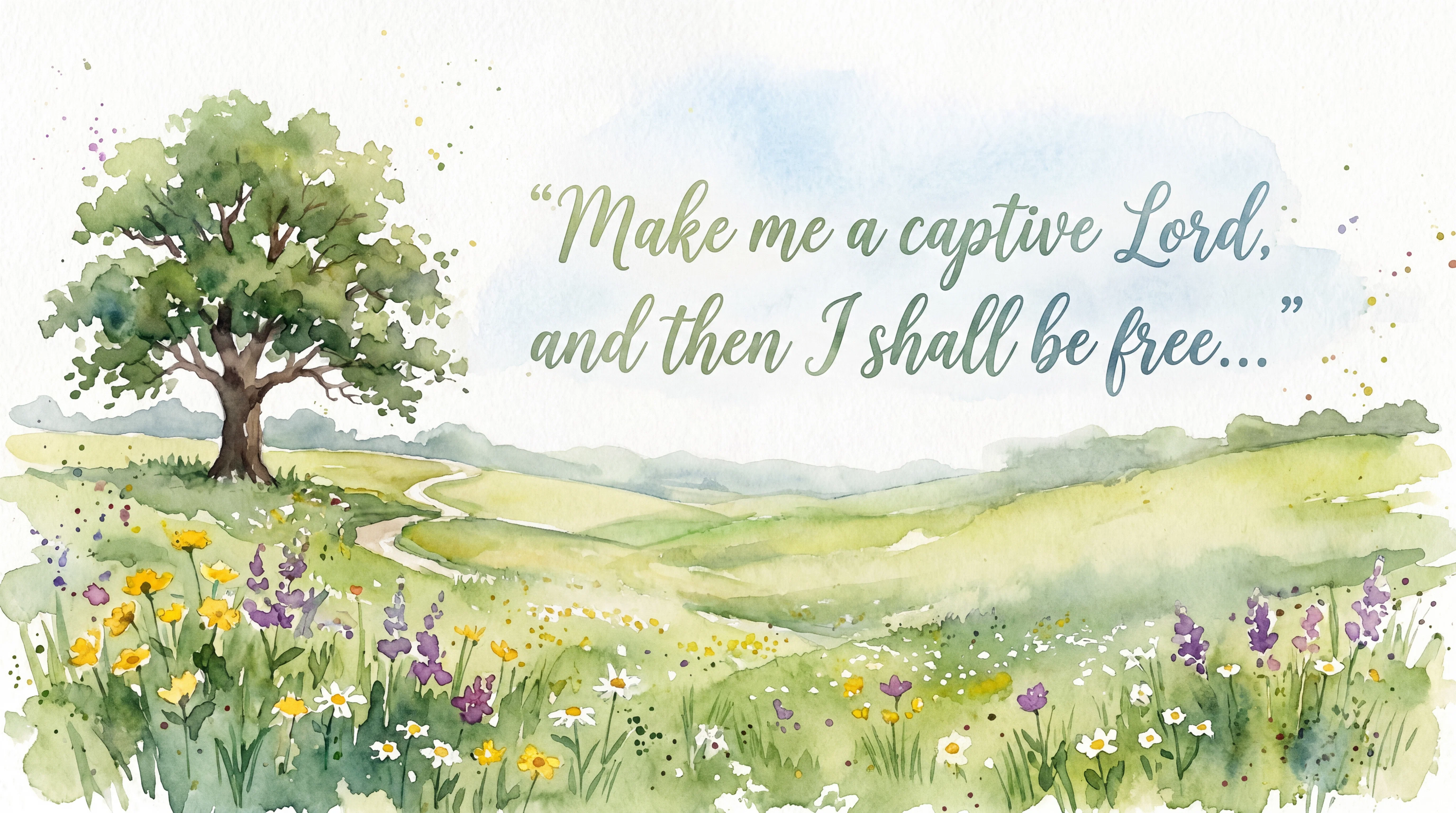 Create a Beautiful field with green grass and wild flowers and these words with the quotation marks and full stop "Make me a captive Lord, and then I shall be free..." on the pic in beautiful font.