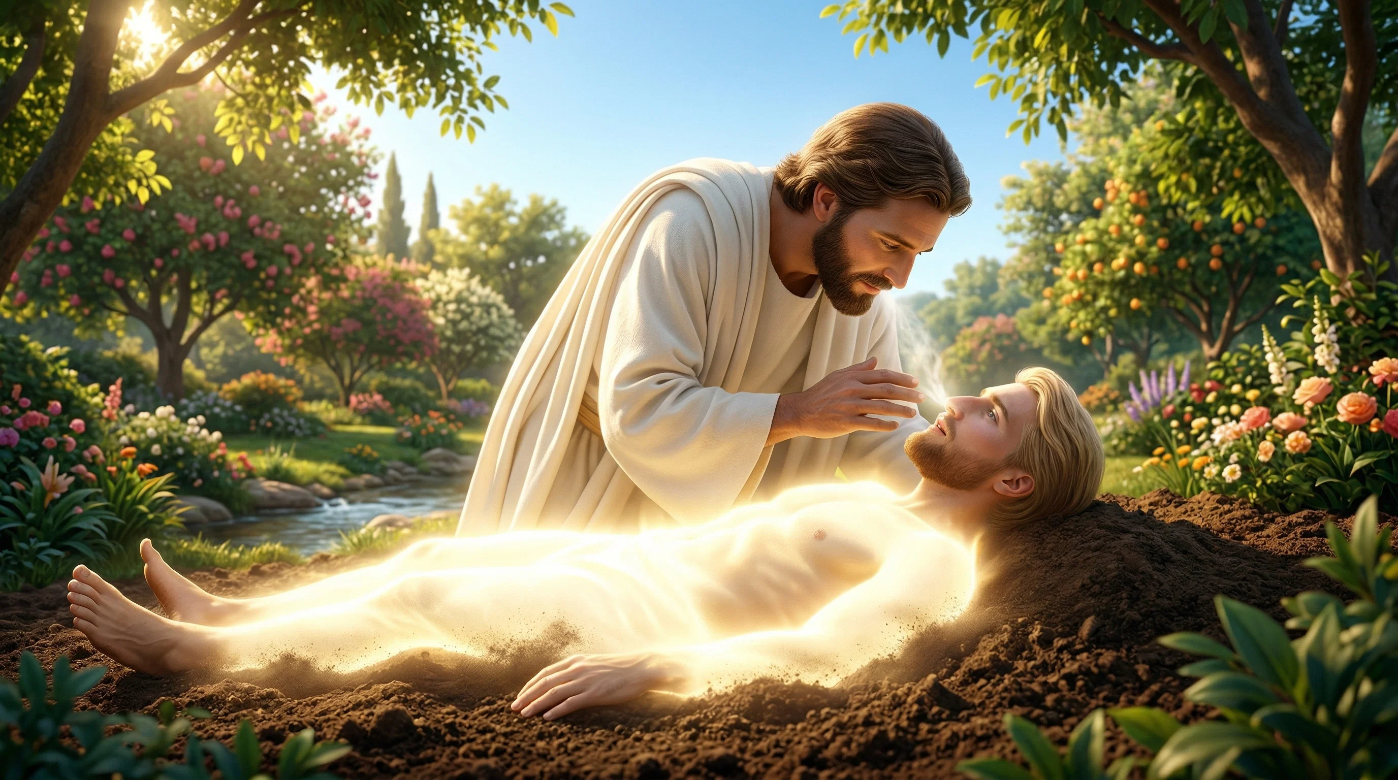 The moment life awakens as the Creator shapes humanity from the humble earth. A powerful scene capturing the first stirring of a soul in the quiet dawn of existence.