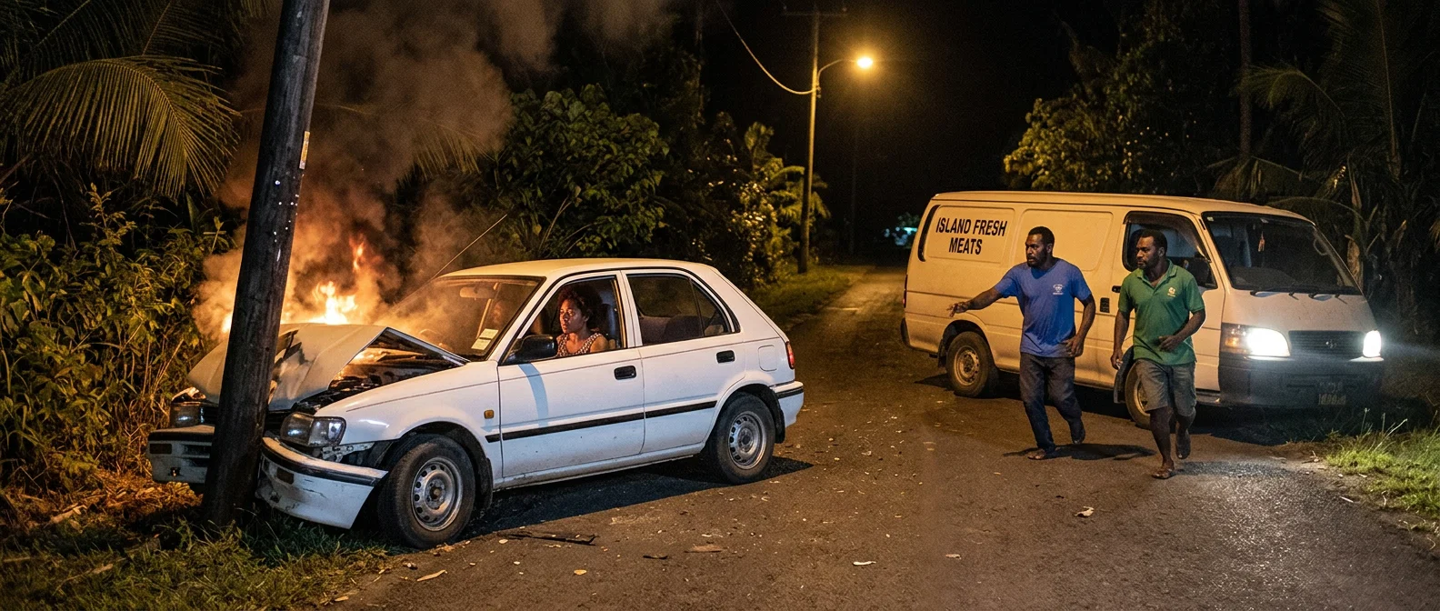 Under the glow of a single streetlight, two men rush to aid a trapped survivor amidst the wreckage of a midnight collision. The stark contrast between the flickering flames and the urgent rescue attempt captures a poignant moment of crisis.