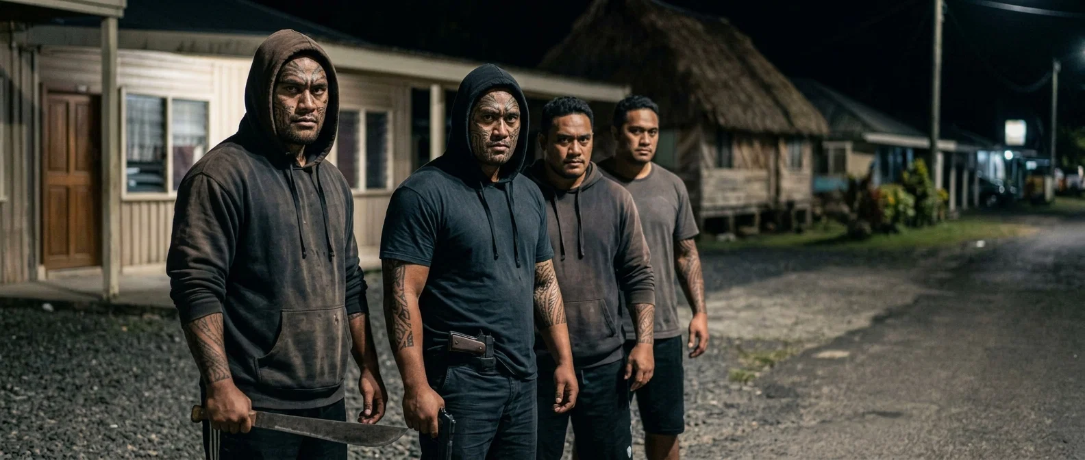A chilling portrait of four hardened individuals captured in the restless atmosphere of a moonlit city street. Their menacing presence and sharp focus create an intense, cinematic scene of raw street-level tension.