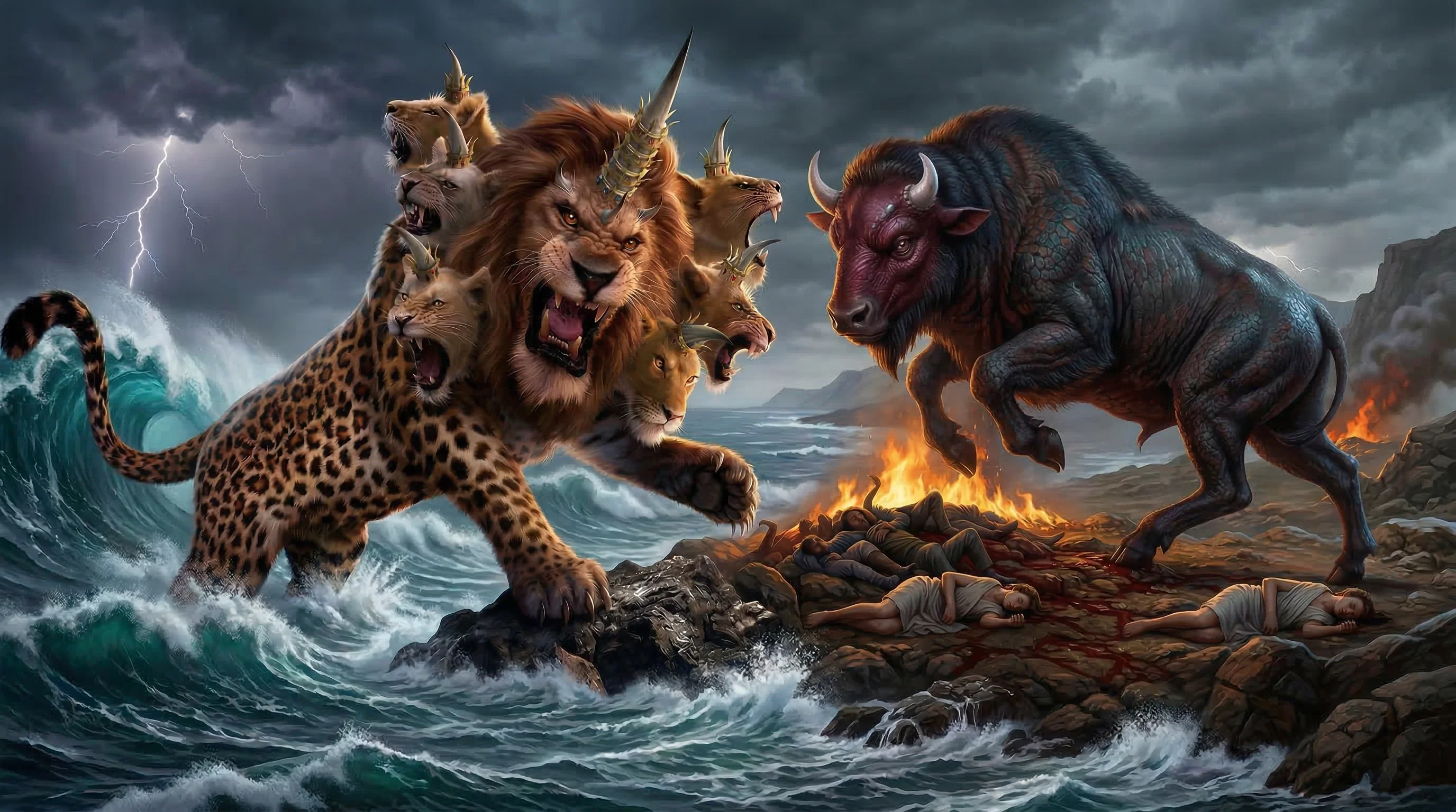 A surreal depiction of symbolic creatures emerging from the sea in a powerful biblical vision. The composition highlights the imposing scale of the beasts within a dramatic and atmospheric landscape.