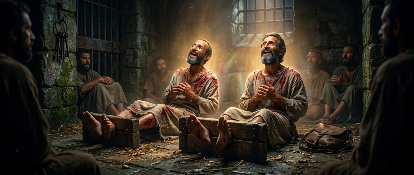 Paul and Silas find profound spiritual freedom while shackled in the darkness of a damp first-century cell. Their voices rise in melodic defiance as they praise God amidst their suffering.