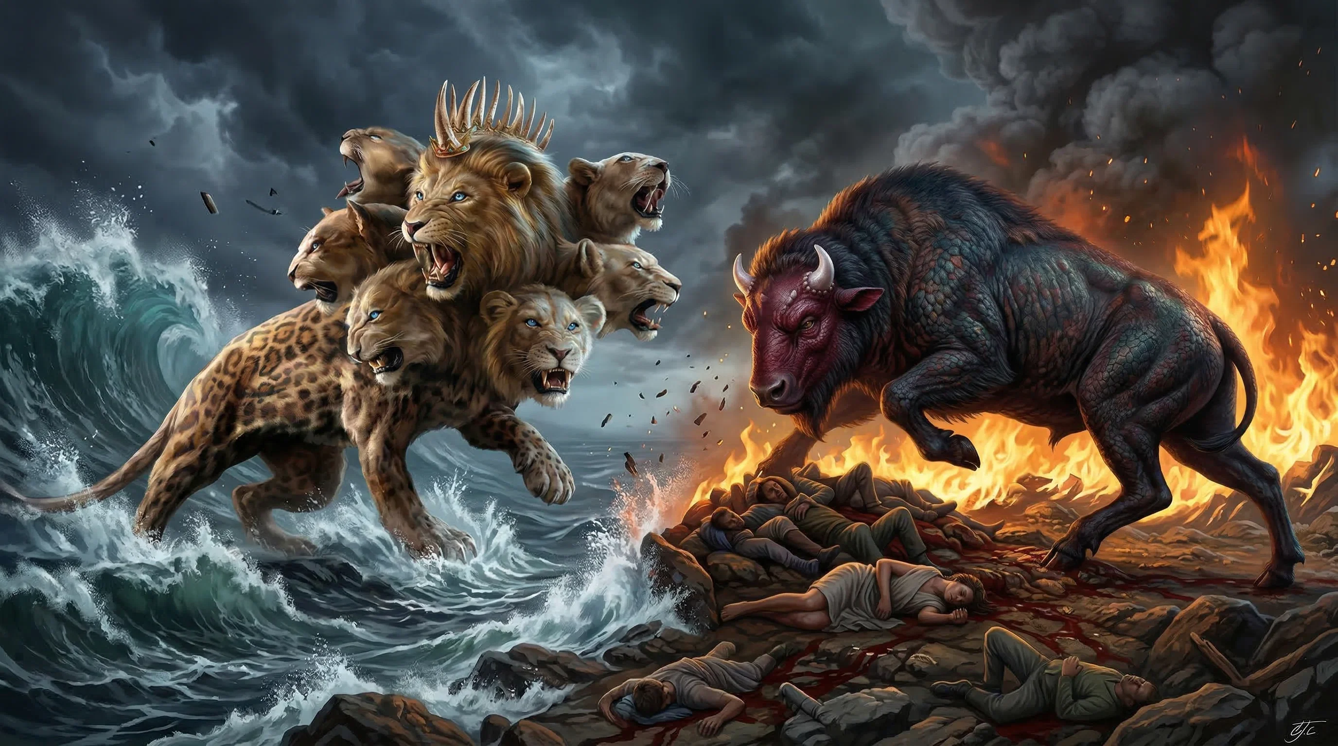 This powerful composition show the two beasts of Revelation 13 that form an unholy coalition to bring about the final crisis of the mark of the beast.
