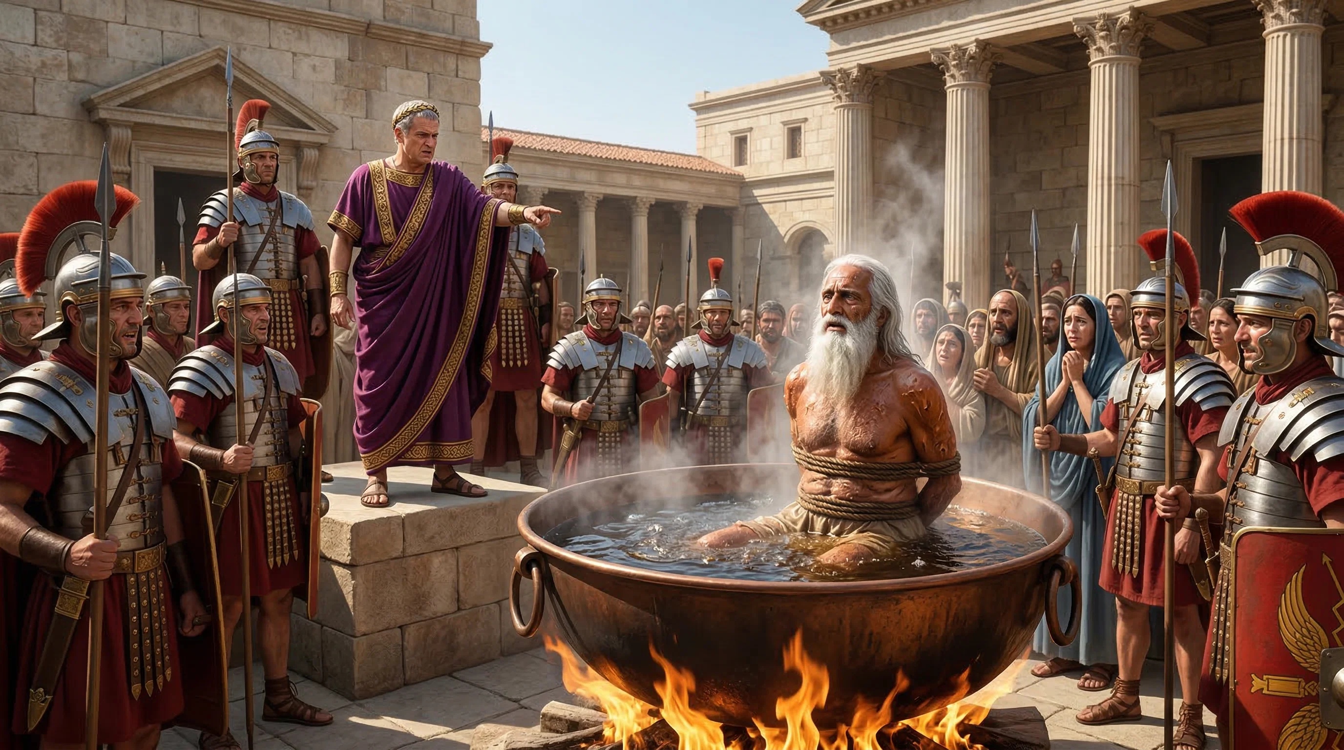 The aged Apostle John stands firm within a vessel of boiling oil, his faith shielding him from the flames as Emperor Domitian watches in disbelief. This dramatic scene captures a pivotal moment of divine endurance amidst the cruelty of the Roman Empire.