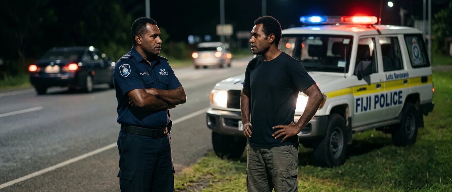 A local man and a police officer engage in a heated roadside encounter illuminated by flashing patrol lights. The moody night setting emphasizes the dramatic exchange between the two figures.