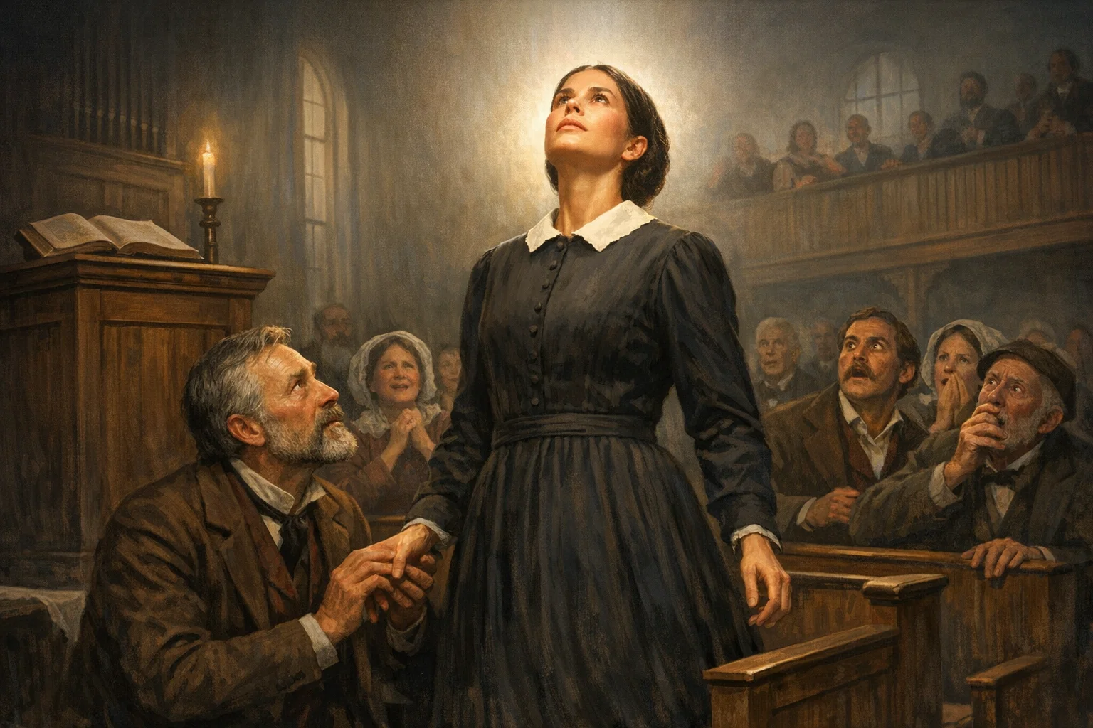 Ellen White stands bathed in ethereal light as she delivers a powerful sermon while caught in a divine encounter. The atmosphere in the church shifts as she experiences a profound spiritual revelation.