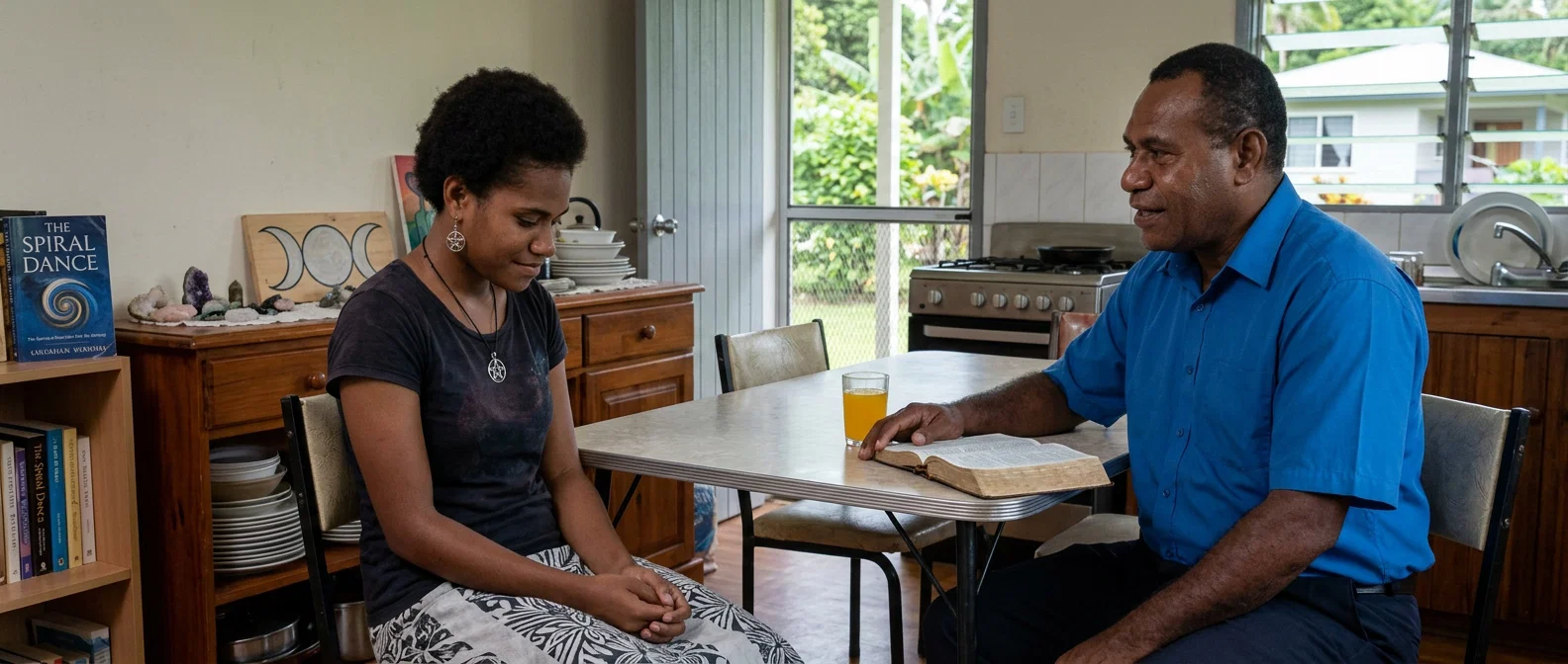 An evangelical pastor shares a thoughtful moment with a woman surrounded by symbols of her eclectic spiritual path. The scene captures a quiet, poignant intersection of contrasting beliefs within a warm Fijian home.