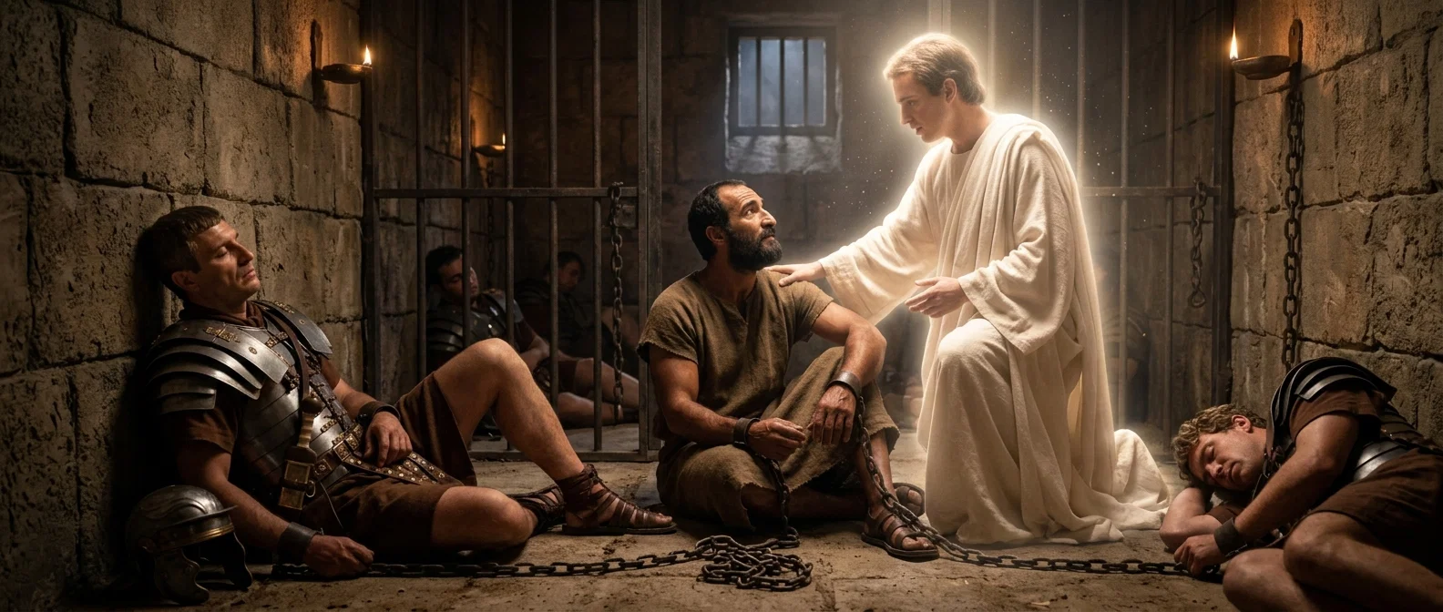 An ethereal light floods a cold prison cell as an angel awakens the apostle Peter from his chains. This cinematic moment captures the profound stillness of divine intervention amidst the harsh reality of Roman imprisonment.