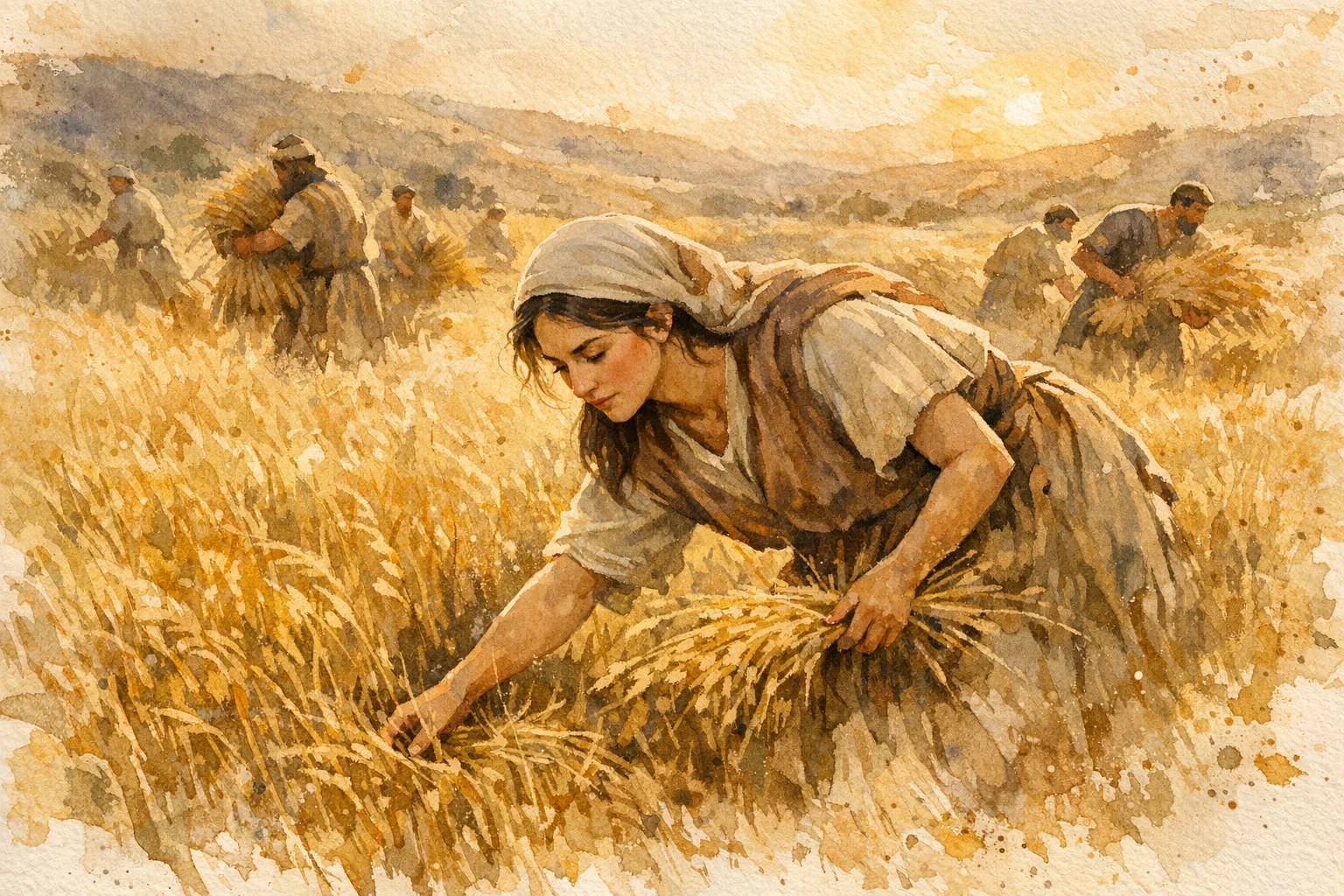 A humble Moabite woman gathers grain under the warm, ethereal glow of a Bethlehem sunset. This cinematic portrait captures the quiet devotion and historical beauty of a timeless biblical scene.