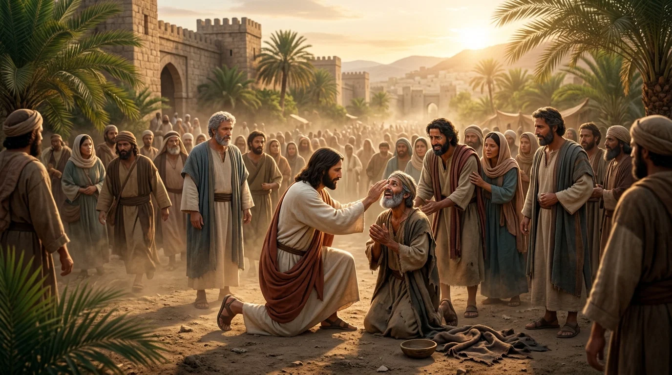Jesus reaches out with compassionate grace to heal the blind beggar by the dusty Jericho roadside. Divine light illuminates this profound moment of restoration and faith.