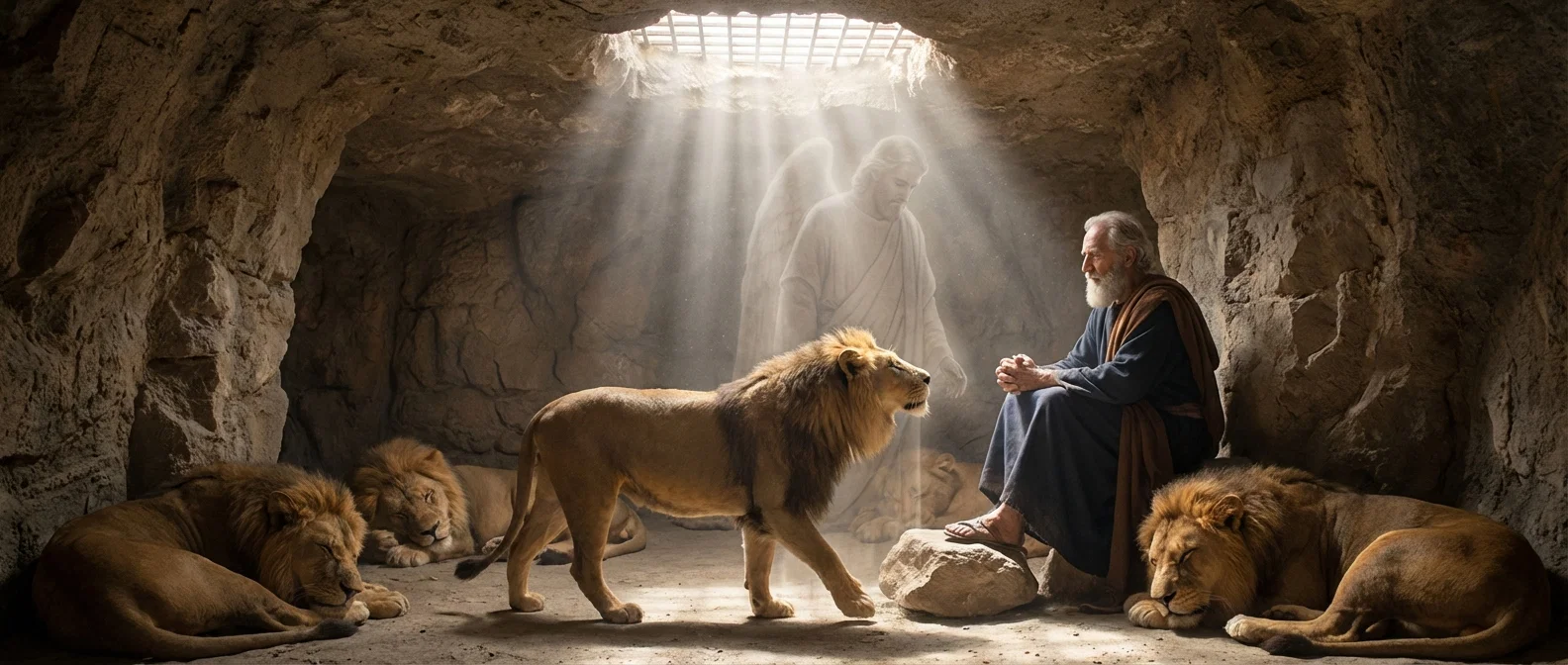 A noble figure sits in serene composure as lions rest at his side, watched over by a luminous angelic presence. This scene captures the miraculous moment of divine intervention amidst the danger of the den.