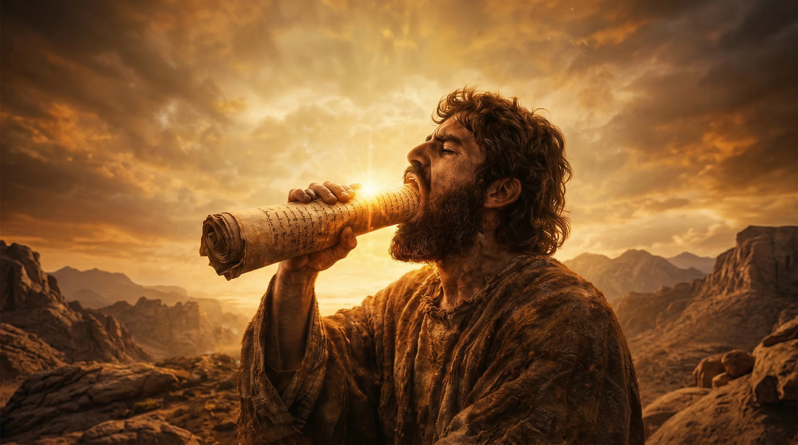 Prophet Ezekiel eating the scroll symbolising how we must receive the message of divine revelation and share it with others.