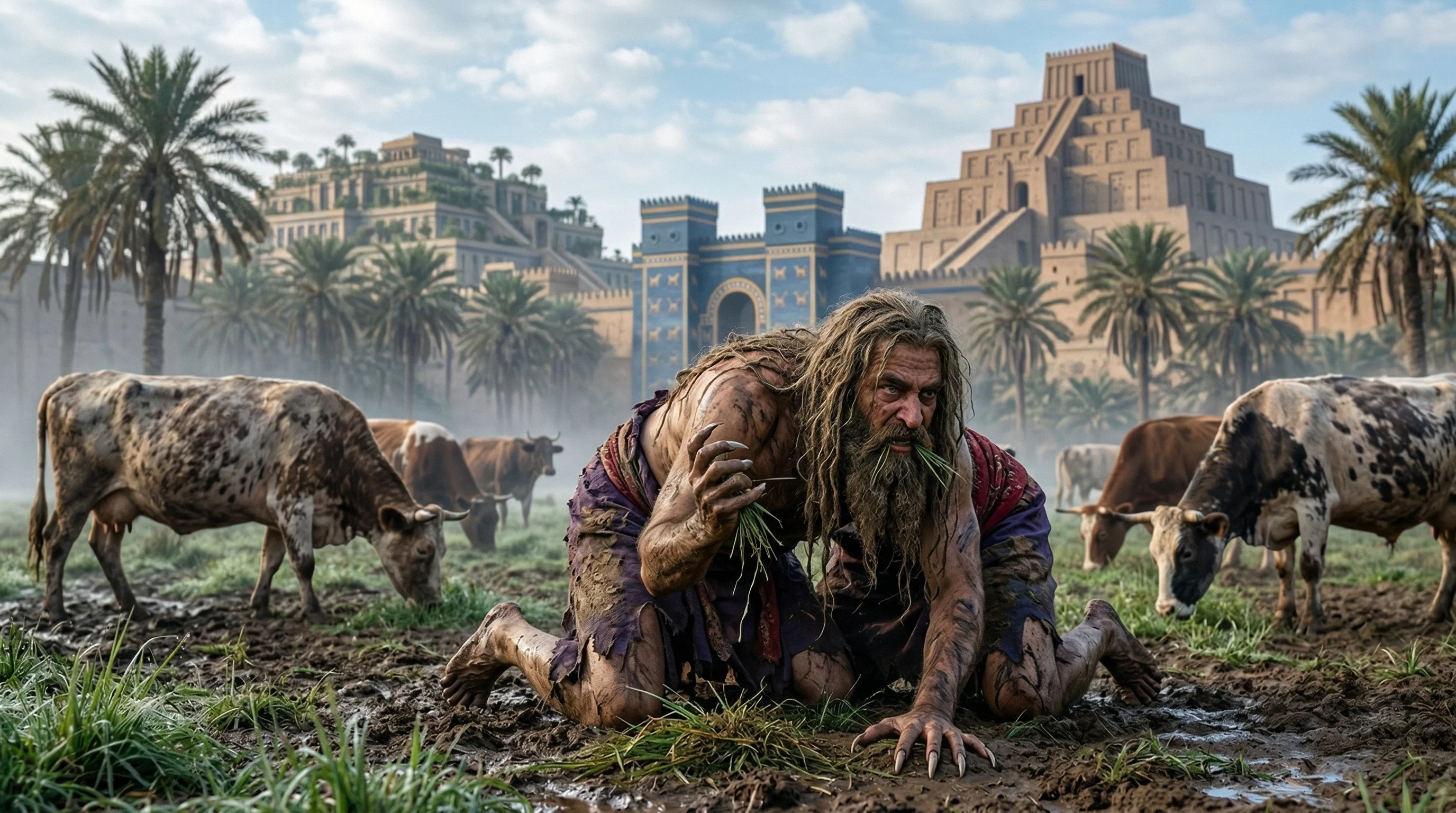 King Nebuchadnezzar wanders through the fields grazing like cattle beneath the looming, ancient skyline of Babylon. This haunting scene captures the dramatic moment of divine judgment and humbling transformation.