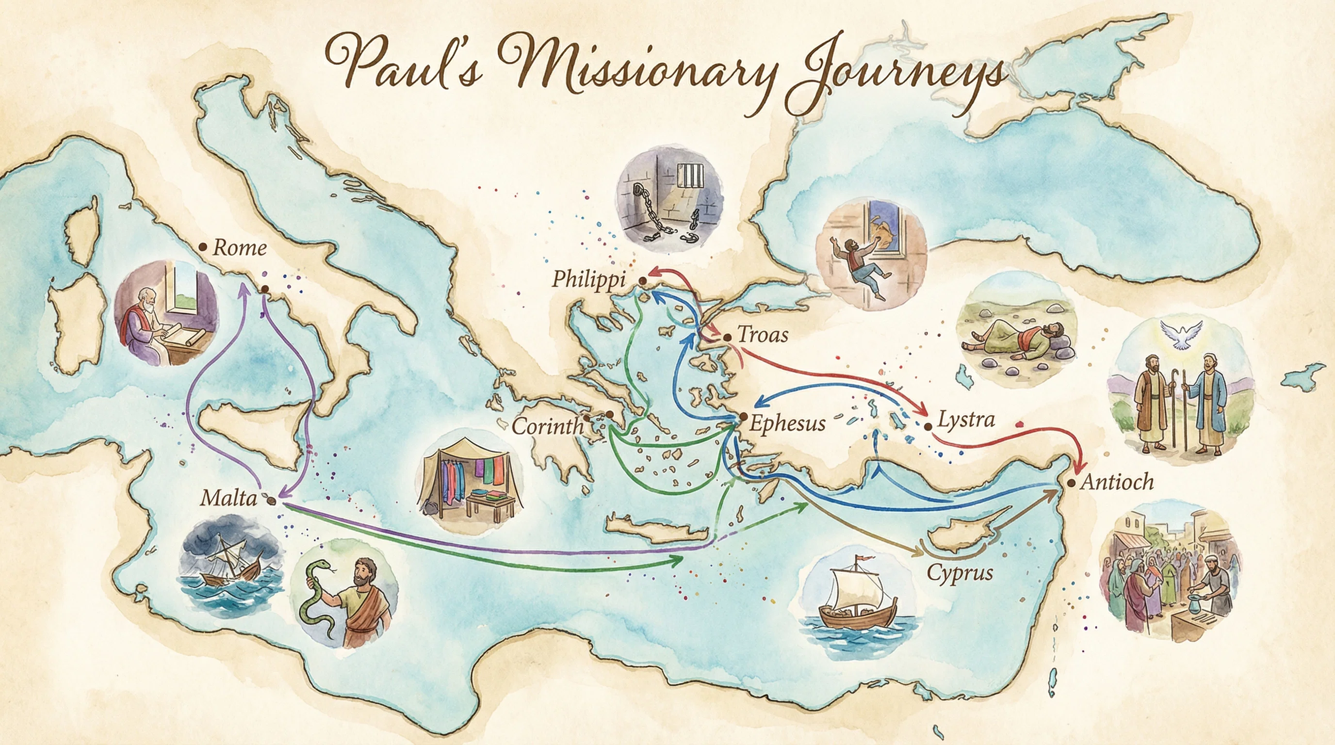 An interactive cartographic journey illustrating the Apostle Paul's epic travels across the ancient Mediterranean. Discover vibrant scenes of key biblical events marked along his transformative path of faith.