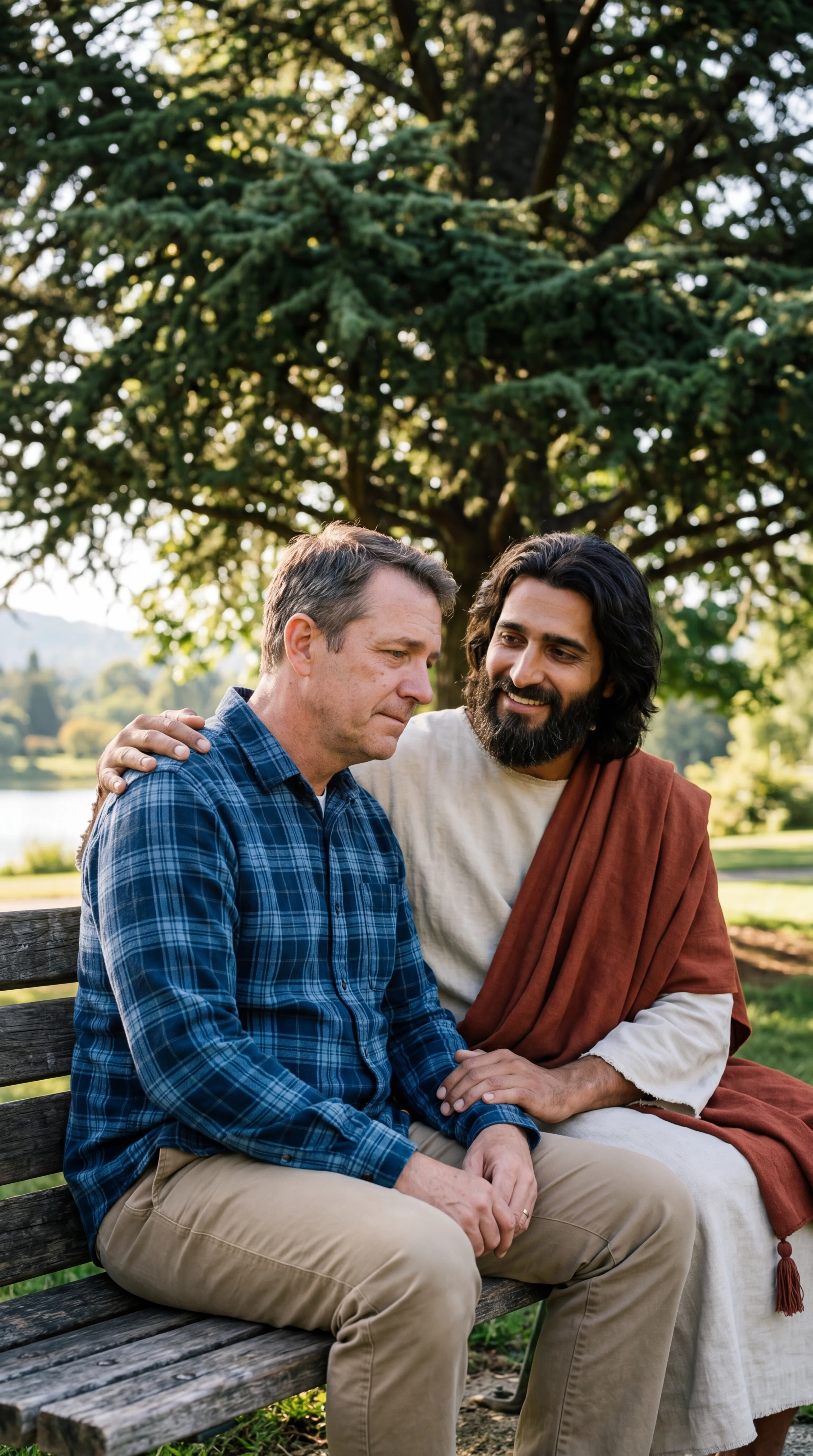 Jesus sitting next to a man on wooden park bench, with his arm around the man. Jesus is smiling in love with his mouth closed, his eyes crinkling with pity. Behind them is a the branches of a green tree, beautiful scenery. Precise details, faces should be normal. The man should have brown hair and be middle-aged, wearing modern clothing.