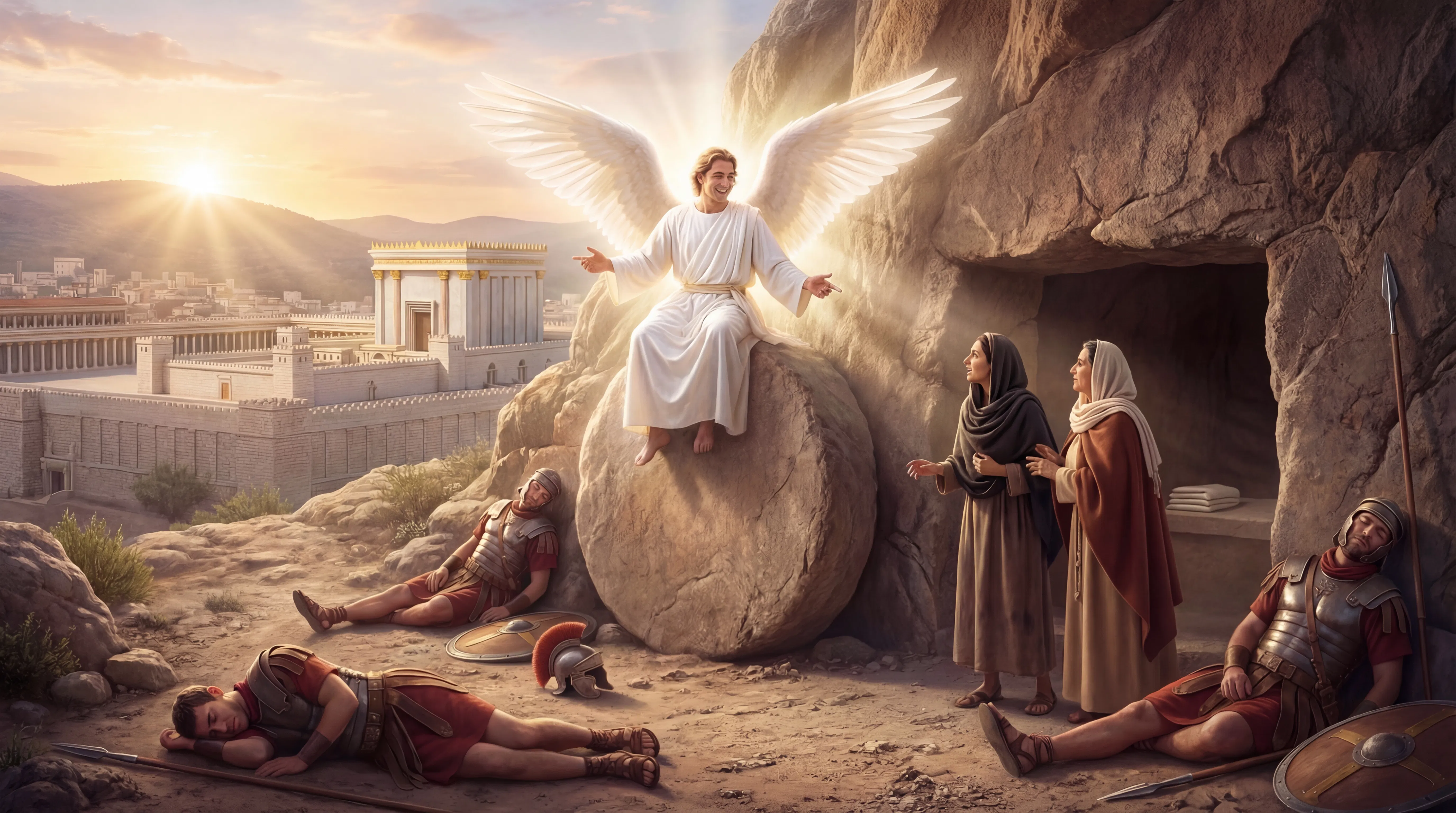 A silent witness to resurrection where the folded burial shroud rests upon the cold stone slab. Light pierces the darkness of the vacant sepulcher, marking a new beginning.