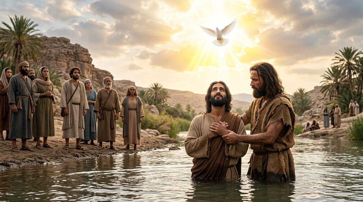Heavenly light illuminates the transformative moment as Jesus is baptized in the tranquil waters. This ethereal scene captures the profound grace and spiritual awakening of a divine encounter.